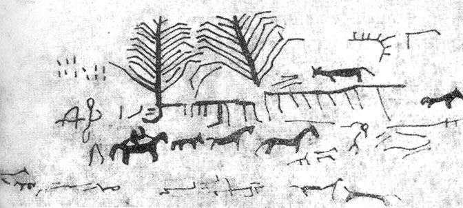 牧马.大树图(摹本) 新疆库鲁克山岩画